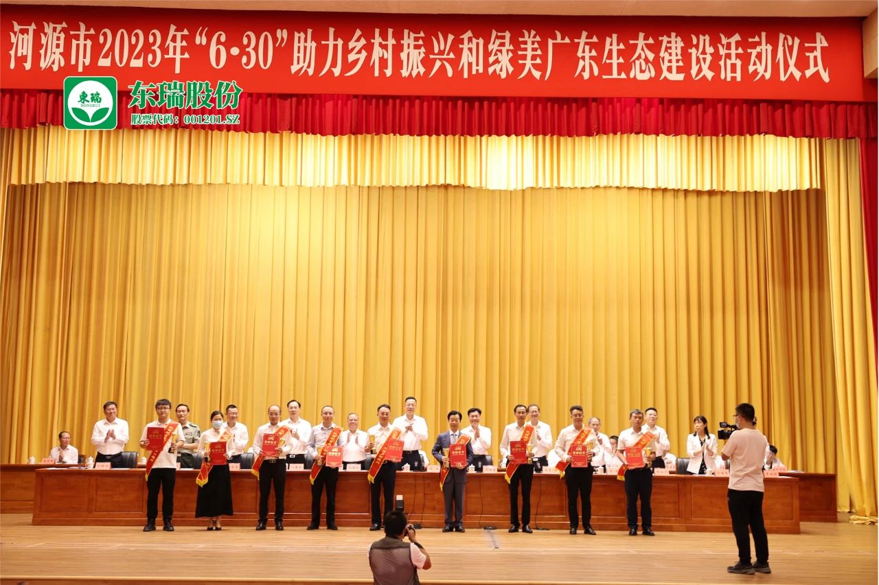 聚焦百千萬工程,踐行高質量發展。6月30日,河源市舉辦2025年“6·30”助力鄉村振興活動,市委副書記吳青川、常務副市長劉東豪、市委常委謝春艷等領導親切會見愛心企業家代表并出席活動儀式,為在2024年度河源市廣東扶貧濟困日活動中作出突出貢獻的企業(團體)授獎,東瑞股份榮獲2024年度“河源市廣東扶貧濟困萬綠杯”。